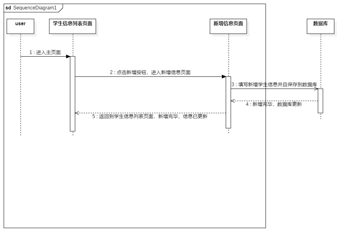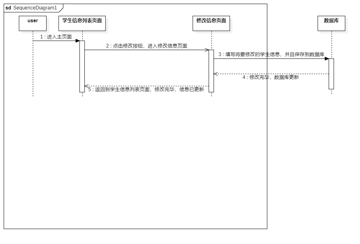 任务3:结合实验五中学生信息增、删、改的操作过程,绘制某一user对象完成学生信息增、删、改的顺序图,除user对象外,顺序图中其他对象需为实验五资源包中定义的类对象。
