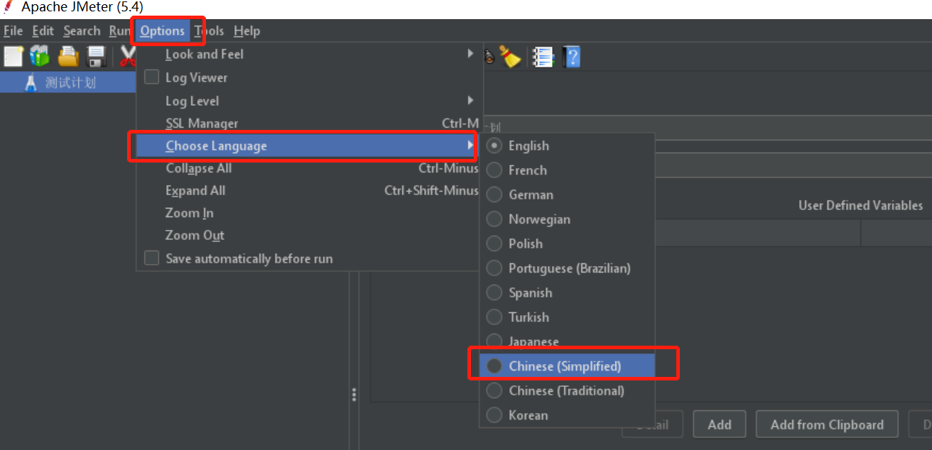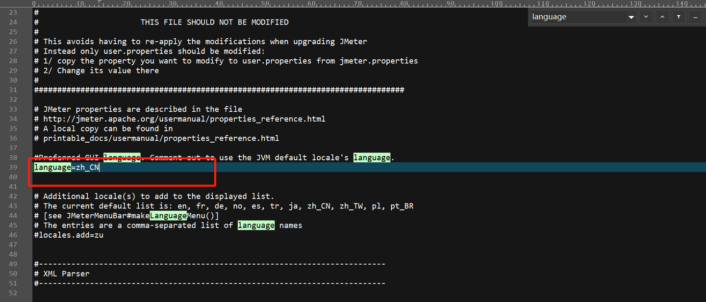 方法二:通过设置jmeter.properties配置文件来设置语言为中文,修改language=zh_CN,重启jmeter