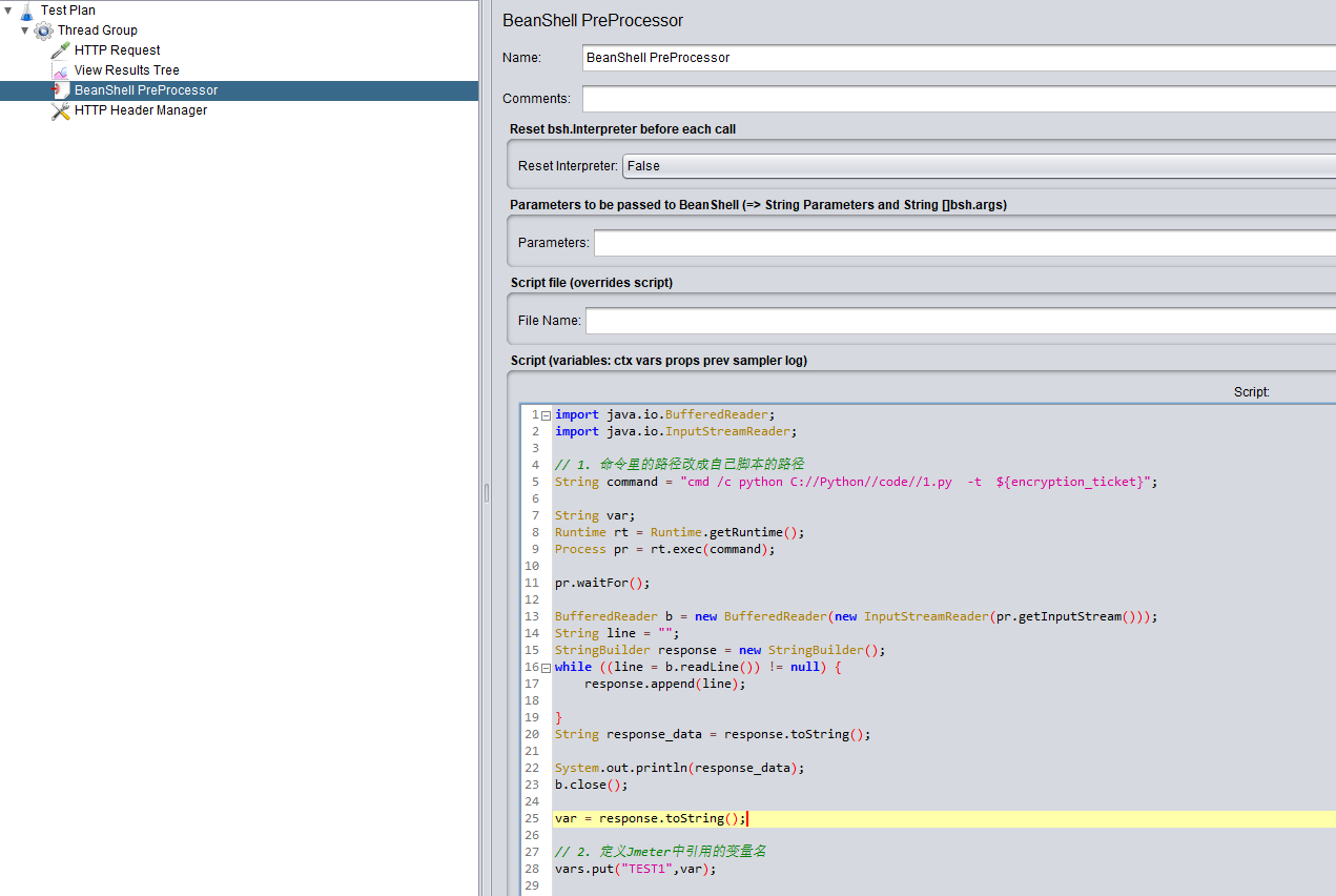 背景:想将Python程序生成的参数直接在Http信息头里进行引用。一开始在网络上查到的方法是JSR223处理器,后来发现JSR223仅支持Python2.7及以下的版本,于是另寻他法,找到了一种用Beanshell调用的方法可以支持Python3,Beanshell本身是Java语法的,但这里只需要复制粘贴别人的代码就行。在自己这里总结一下。