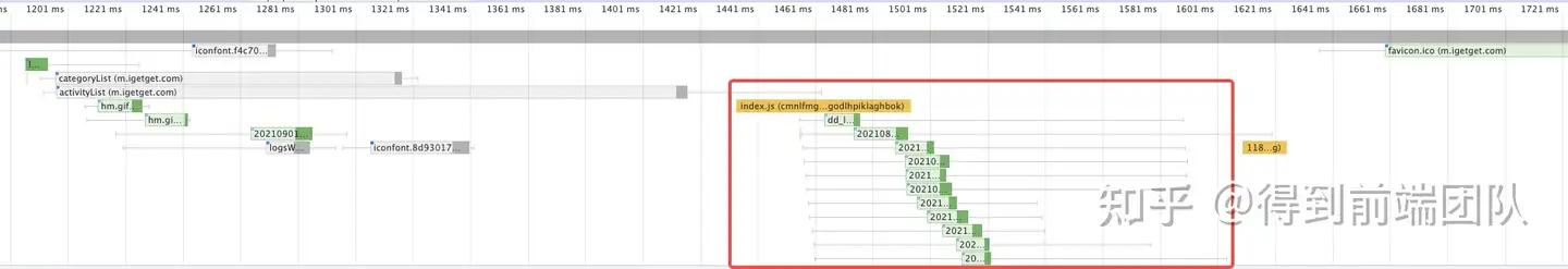 每条彩色横杠表示一种资源。横杠越长,检索资源所需的时间越长。 每个横杠的浅色部分表示等待时间(从请求资源到第一个字节下载完成的时间)