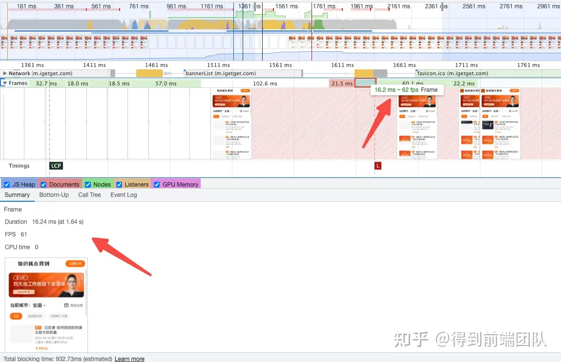 FPS曲线有部分标红,说明页面存在部分渲染卡顿