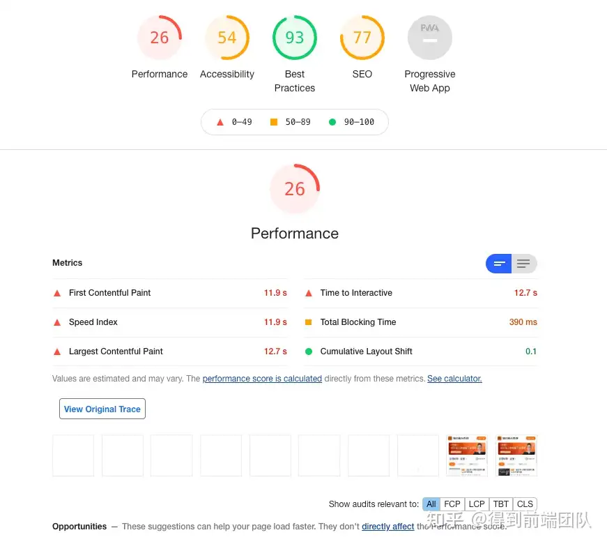 - Speed Index:速度指标是一个页面加载性能指标,向你展示明显填充页面内容的速度,此指标的分数越低越好。