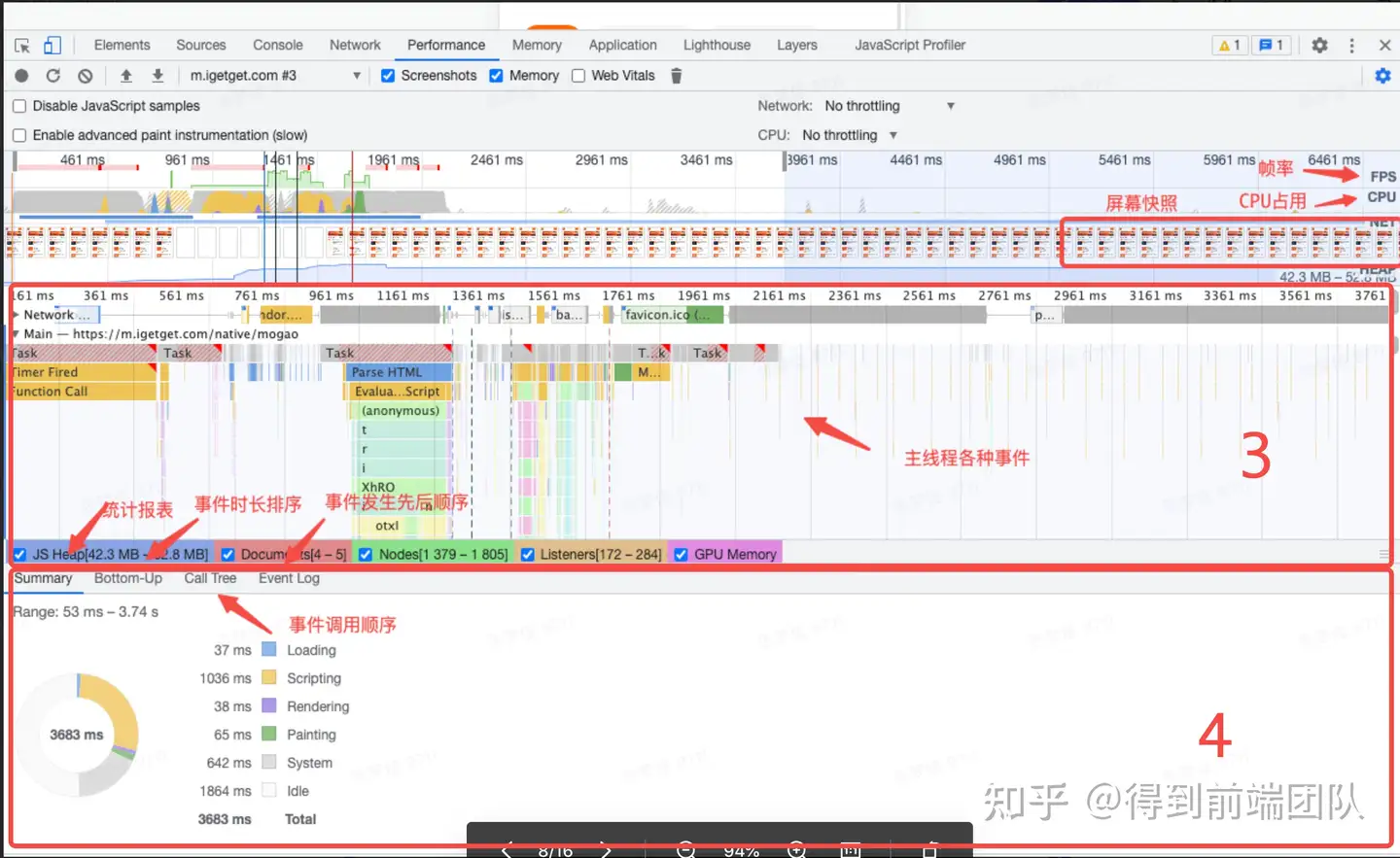 屏幕快照区域将屏幕逐帧录制下来,可以帮助观察页面的状态,帮助分析首屏渲染速度。也可以帮助估算页面加载白屏时间。