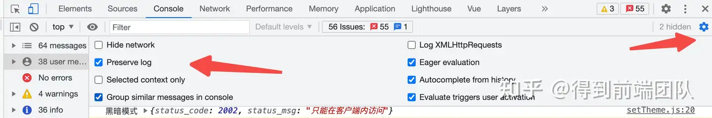 在我们调试页面时,经常遇到页面跳转或刷新的情况,此时打印的输出会被刷新掉 ,看不到想要的数据。点击最右边的齿轮,有 Preserve Log选项,可以保存上一次打印的输出