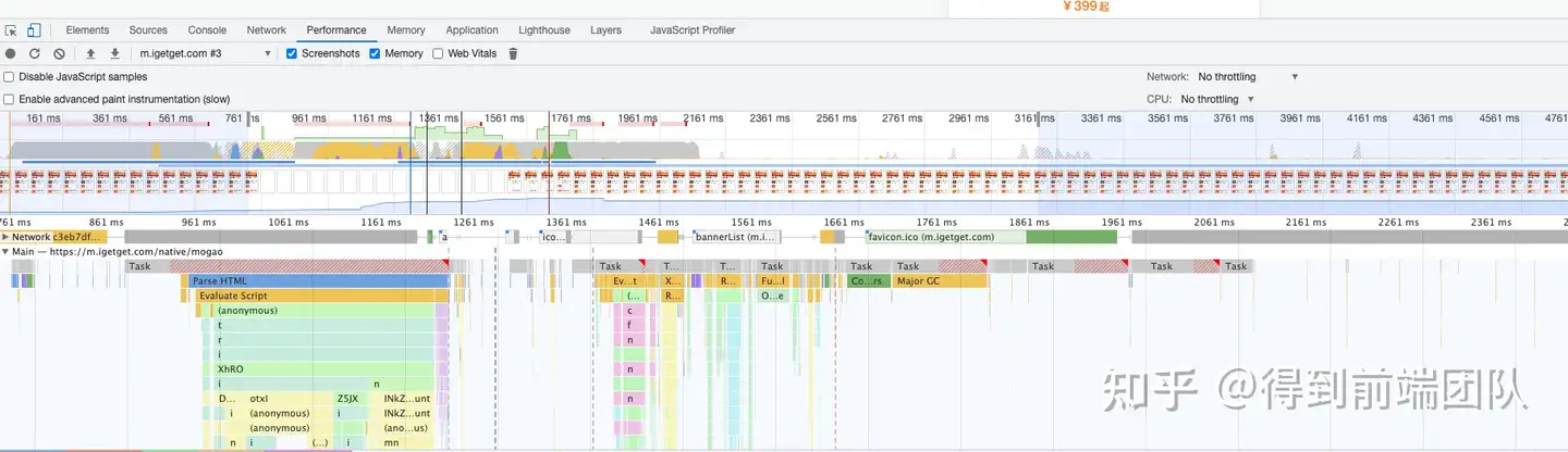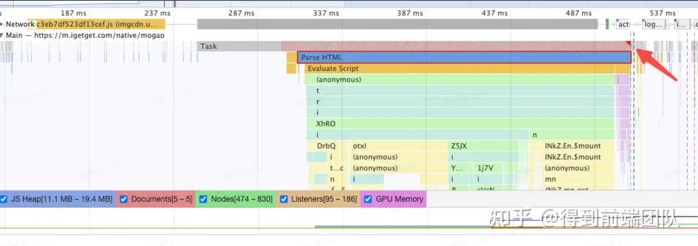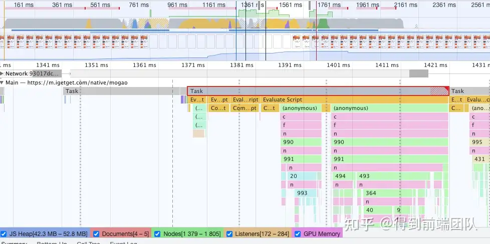 面板中会有很多的 Task,如果是耗时长的 Task,其右上角会有红色三角号,这是chrome自动帮助识别出有问题的部分,图中没有,说明页面首屏的逻辑处理分配得还不错。点任一任务,都可在下面统计区域里看其具体的信息