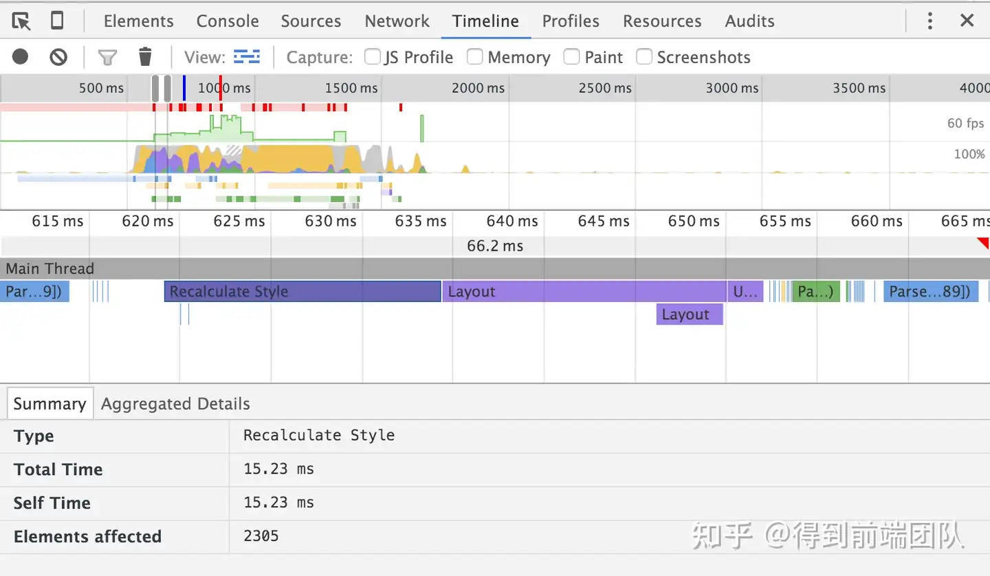 - 红色:意味着帧数已经下降到影响用户体验的程度,chrome帮忙标注了,这块有问题