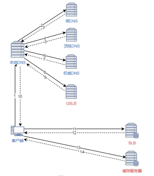 - 本地 DNS 再向 GSLB 发出请求,GSLB 的主要功能是根据本地 DNS 的 IP 地址判断用户的位置,筛选出距离用户较近的本地负载均衡系统(SLB),并将该 SLB 的 IP 地址作为结果返回给本地 DNS。