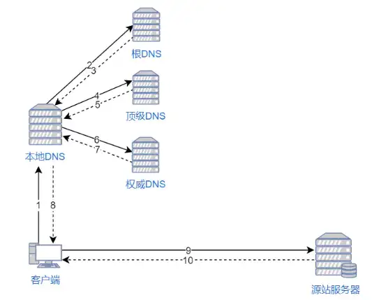 - 本地 DNS 依次向根服务器、顶级域名服务器、权限服务器发出请求,得到网站服务器的 IP 地址。