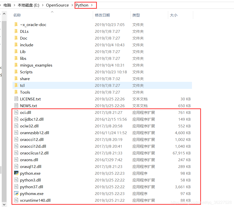 4. 把oracle客户端的安装文件中以.dll结尾的文件复制到python的安装目录中