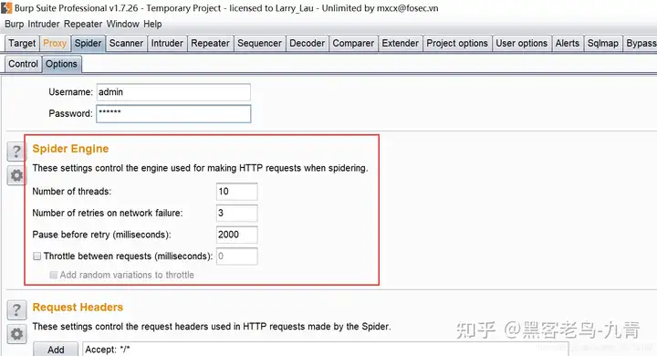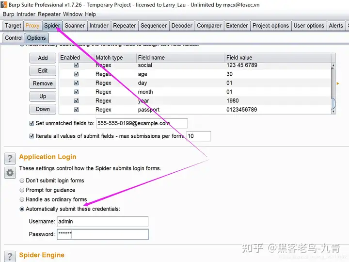 还有一个选项是Application Login,我们可以在这里设置默认的账号密码。如果bp爬取到需要登录的网页,就会填入我们输入的账号密码。
