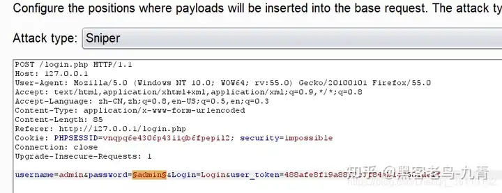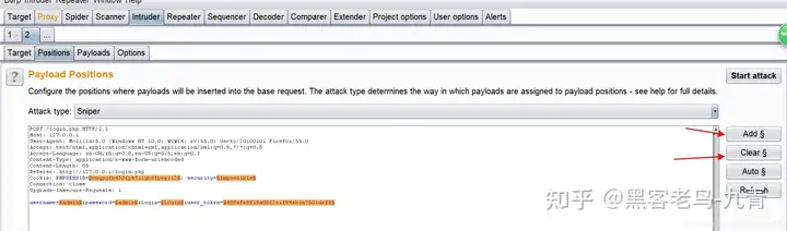 在 Intruder 模块下的 Positions,burpsuite会自动把可能是爆破的地方进行标记。我们可以点击右边的clear清除,然后选择我们自己要爆破的地方,点击 add