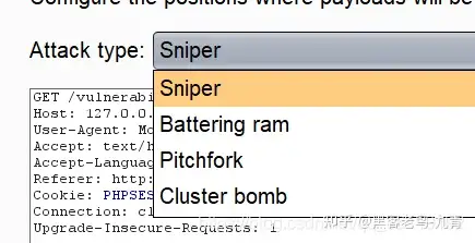 - Cluster bomb:每个变量对应一个字典,并且进行交集破解,尝试各种组合。最少设置2处攻击点,最多设置20处攻击点。适用于用户名+密码的组合