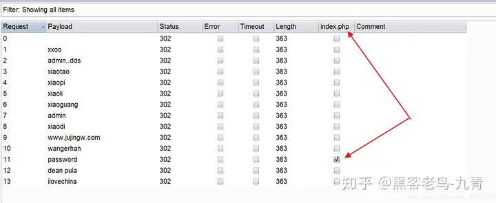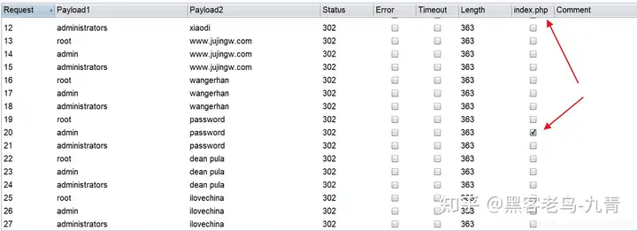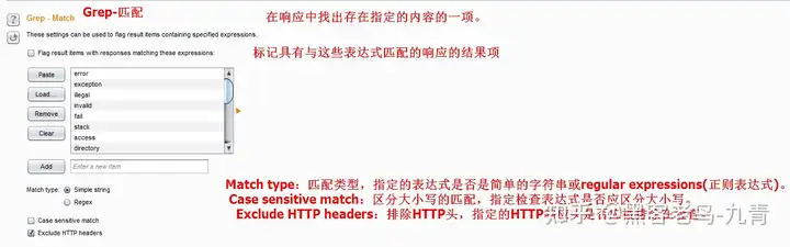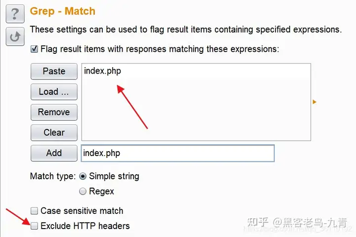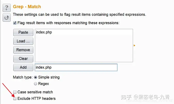 去Grep-match,这是对结果进行匹配的。也就是说对数据包返回的结果进行匹配,匹配规则我们自己设置。我们把Exclude HTTP headers 这里的勾选去掉,因为我们是根据返回头里面是否包含 index.php 来判断是否登录成功的!这就要我们分析登录成功和登录失败返回数据中哪里不同来判断是否登录成功