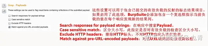 Grep - Payloads: 这些设置可以用于包含已提交的有效负载的反射的标志结果项目。如果启用了此选项,BurpSuite会添加包含一个复选框指示当前负载的值在每个响应发现新的结果列
