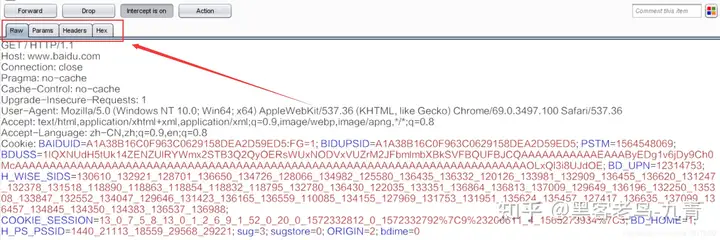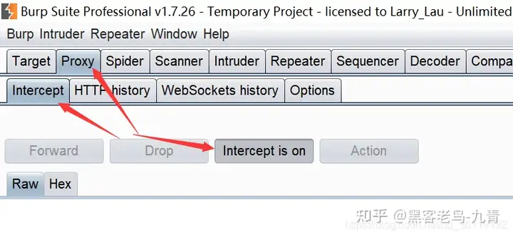 这里Proxy的intercept这里显示Intercept is on表示拦截包开启,所有代理的包都必须经过BurpSuite放行才可以走