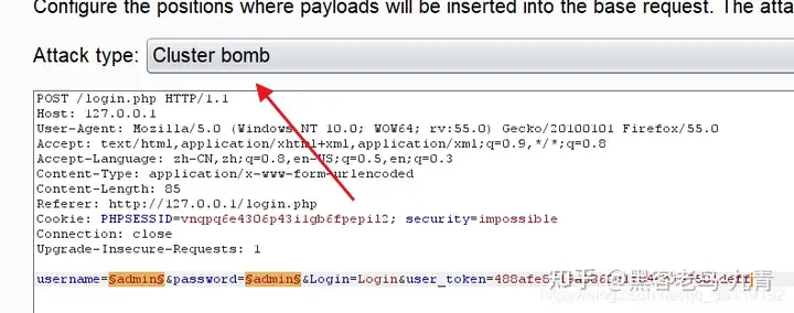 Attack-type攻击类型,这里我们选择 Cluster bomb ,这个模式下可以设置多处爆破点。这里我们设置username和password两处爆破点