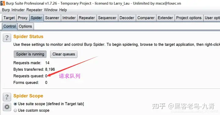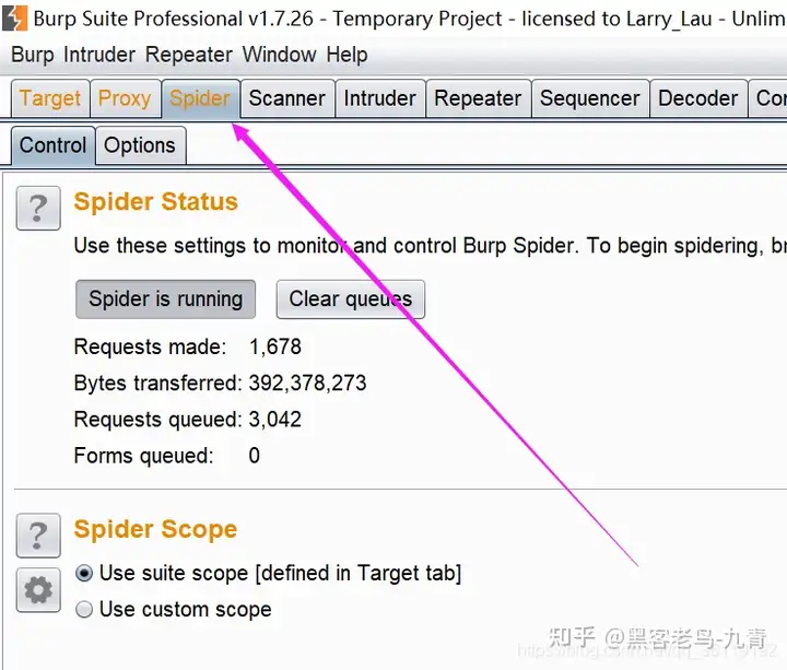 然后我们切换到 Spider 窗口,就会看到BurpSuite已经在爬目录了。