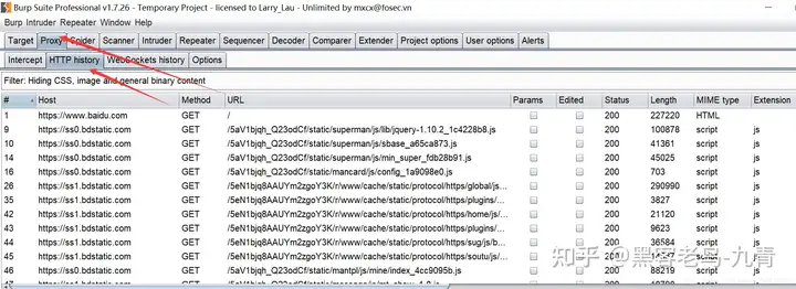 如果这里我们选择Intercept is off的话,那么所有的包都会经过BurpSuite,可以在HTTP history看所有经过的包,但是BurpSuite不会对经过的包进行拦截