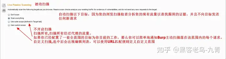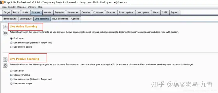 实时扫描可让您决定哪些内容通过使用浏览器的目标应用,通过BurpProxy服务器进行扫描。您可以实时主动扫描设定live active scanning(积极扫描)和live passive(被动扫描)两种扫描模式。
