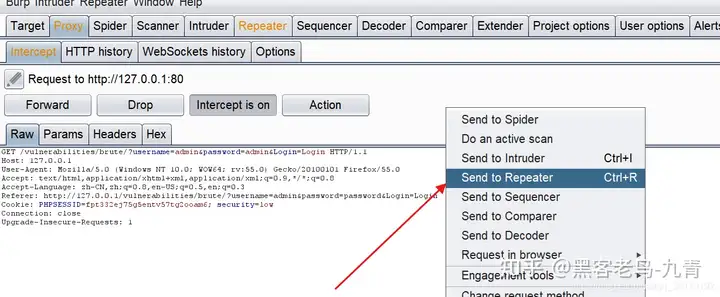 我们抓一个包来看看,抓取包之后,右键Send to Repeater发送重放模块