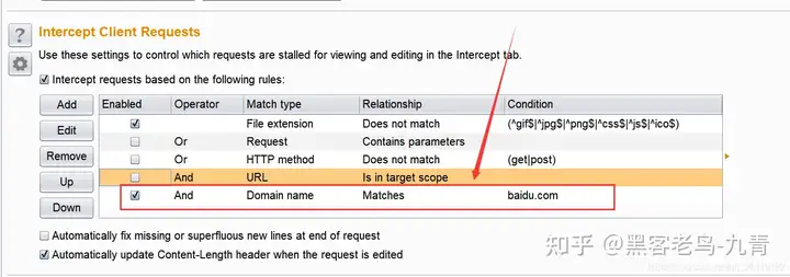 最后多了下面这一行,以后我们的burpsuite的拦截模式开启了,也只会拦截http://baidu.com域名下的数据包