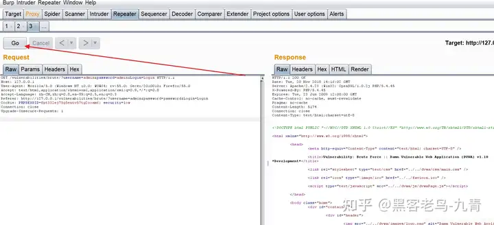 在Repeater模块,我们可以随意修改数据包。修改完后,点击go,就可以发包了。右边就会显示服务器回的包
