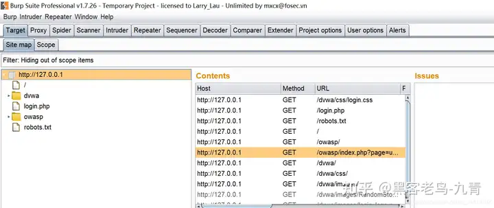 Scanner模块主要用于自动检测Web系统的各种漏洞。Scanner扫描模块和其他扫描器不同的是,Scanner扫描是对BurpSuite当前历史记录中抓到的数据包进行扫描。也就是他不会进行自动化的对网站先爬虫然后扫描。所以进行Scanner扫描前,我们先将代理的Intercept模块设置为off,然后手动浏览网站的所有页面,在进行扫描。