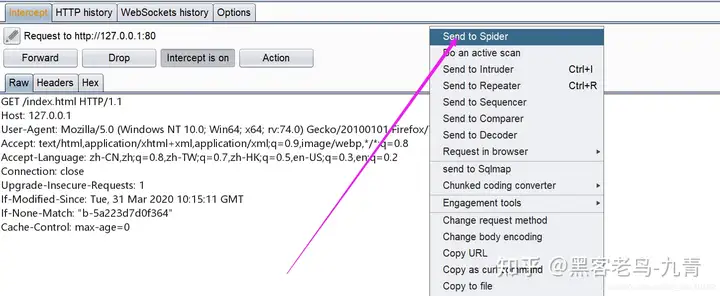 开启我们的BurpSuite,拦截网站数据包,右键,Send to Spider