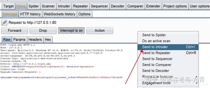 第一步,我们将抓取到的数据包发送到Intruder模块。右键->Send to Intruder