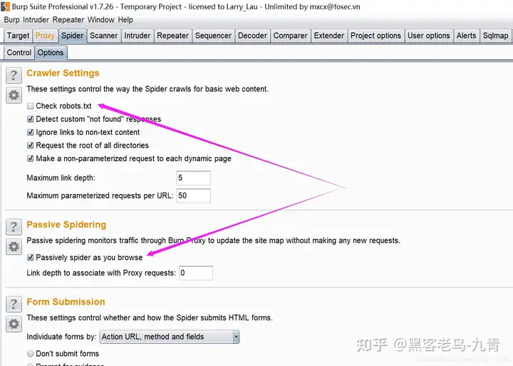 Spider 标签的 Options 标签是对爬虫的设置。我这里取消勾选了 Check robots.txt选项,这样BurpSuite就会爬取robots.txt不允许爬取的目录了。还有一个选项是”passively spider as you browse(被动蜘蛛浏览)”,Burp Spider可以以被动和主动模式运行。