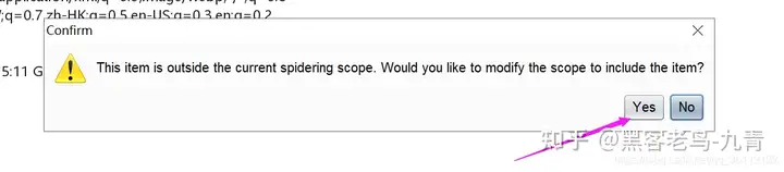 接下来会弹出一个警告弹窗提示:这个Item不在当前的作用域中,是否将这个网站添加到作用域中,我们点击 Yes