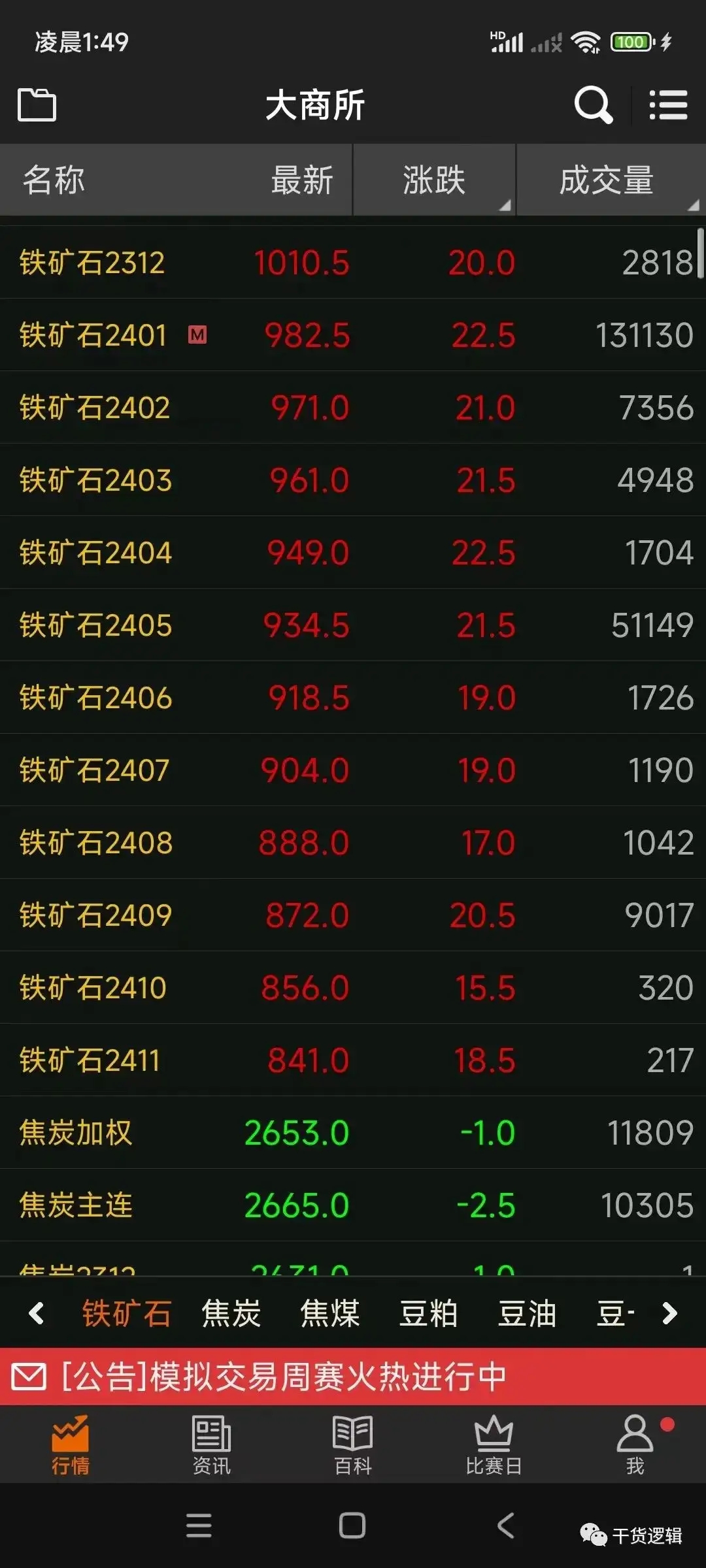 如果这个市场上看好铁矿石未来价格的人多了,于是做买的人会增加,当同个价位上签买的人多于签卖的人,多出来的做多者只能去到更高的交割价位,寻求愿意签卖的人与之成交,当他们这么做的时候,就会看到铁矿石2312合约的最新成交交割价上涨。