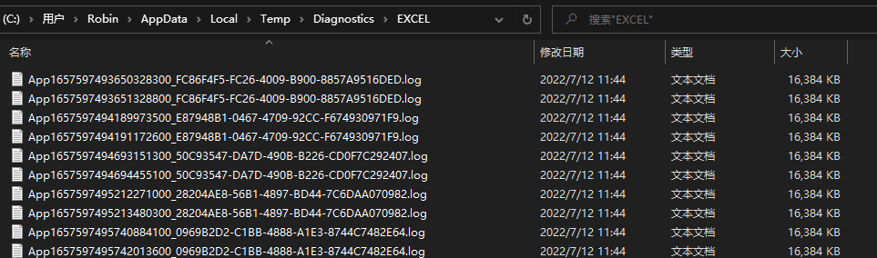 突然发现C盘储存空间不够,排查发现路径C:\Users\Robin\AppData\Local\Temp\Diagnostics\EXCEL下有很多大小为16MB的日志文件