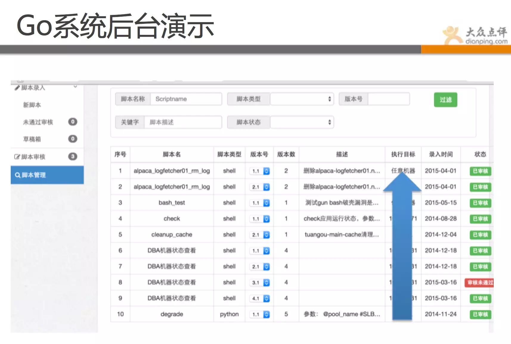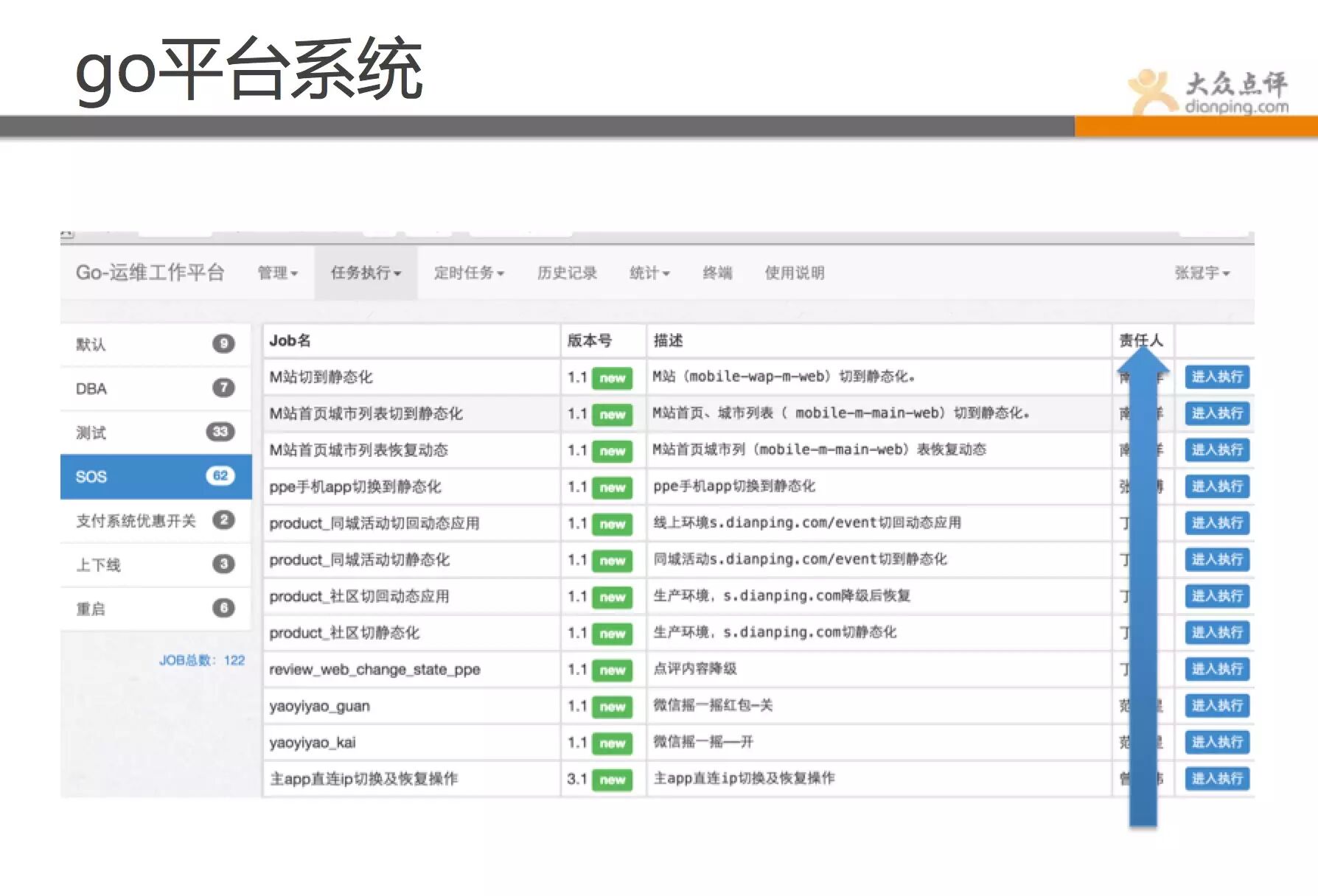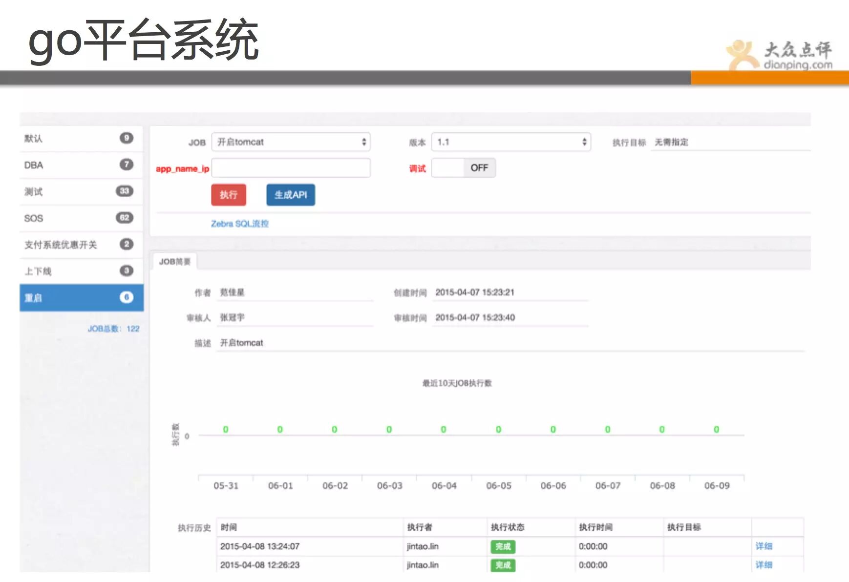 该系统主要是解决运维水平参差不齐,工具又各有各的用法,比如说批量重启操作,有用ssh、有用fabric、有自己写shell脚本的。 干脆直接统一,进行规范,定义出来操作,通过平台化进行标准化。 由于长时间不出问题,偶尔出一下,运维长时间不操作,找个批量重启脚本还要找半天。 哪些不能自动化的,我们基本都做到go里了,在这里基本都是一键式的傻瓜操作了。