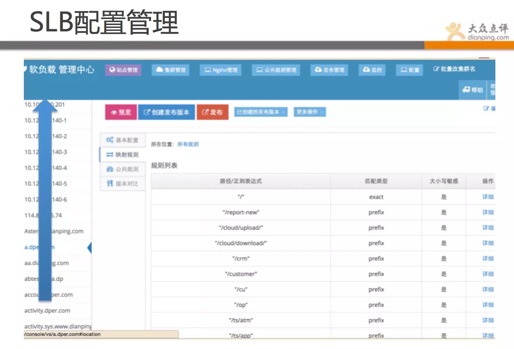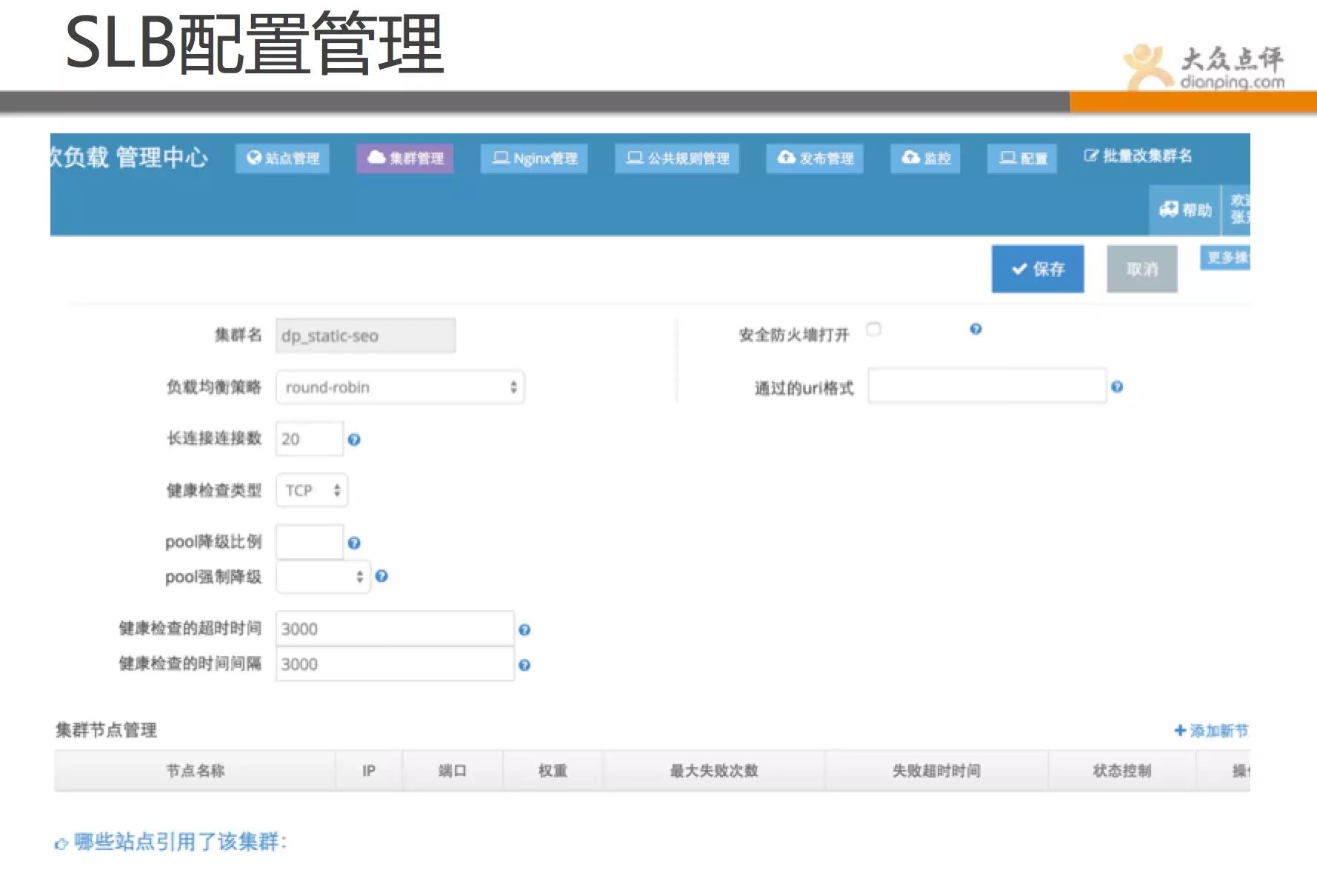 下面展示的是我们的软负载均衡管理页面,该系统是线上SLB的管理系统。 其核心在于把nginx语法通过xml进行解析,实现web化管理,傻瓜式配置,规范化配置,避免误操作,版本控制,故障回滚等。