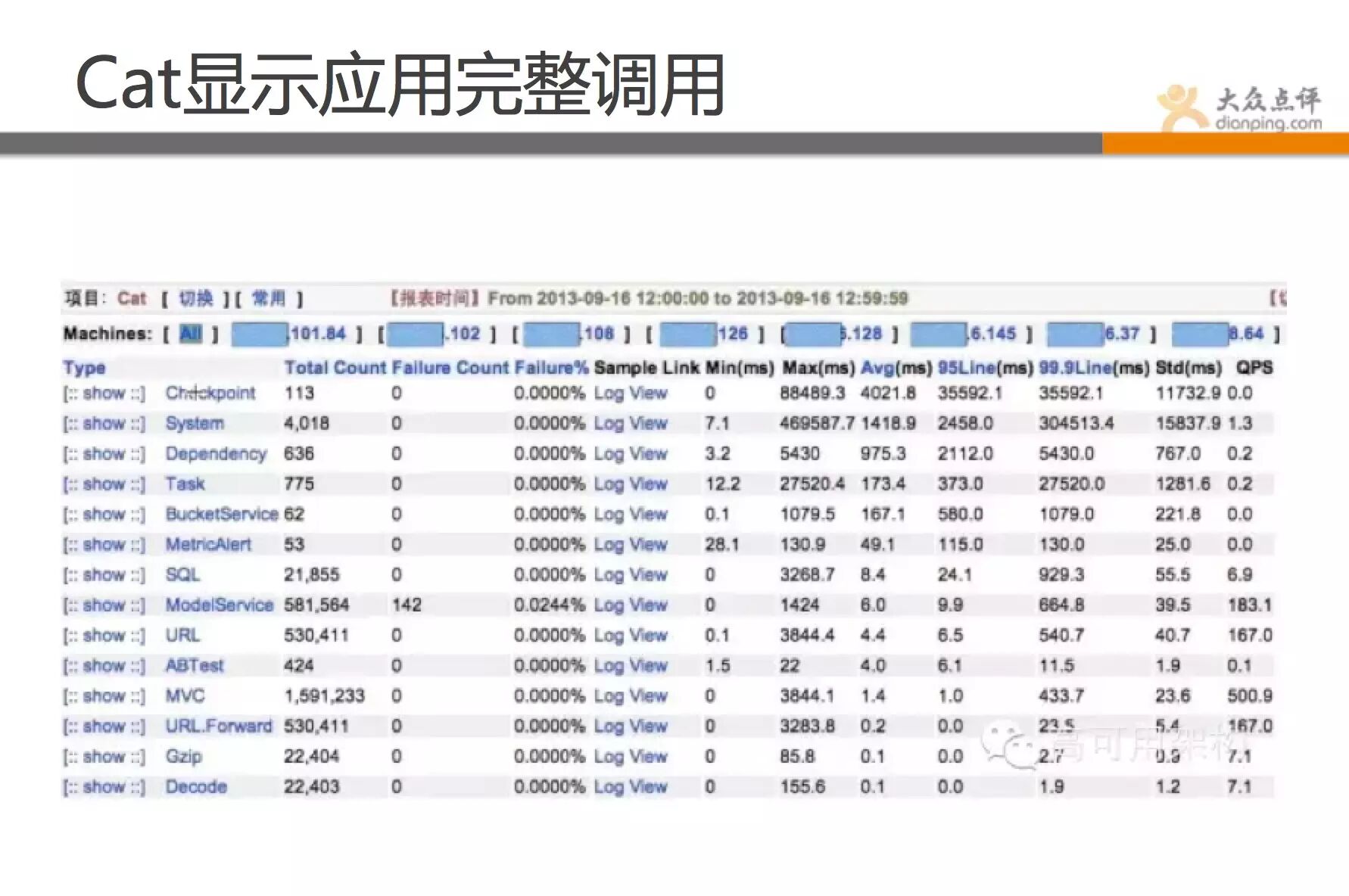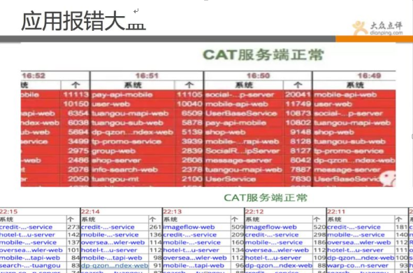 应用层面,每个应用的错误数,调用过程,访问的平均耗时,最大耗时,95线等(cat)。