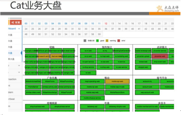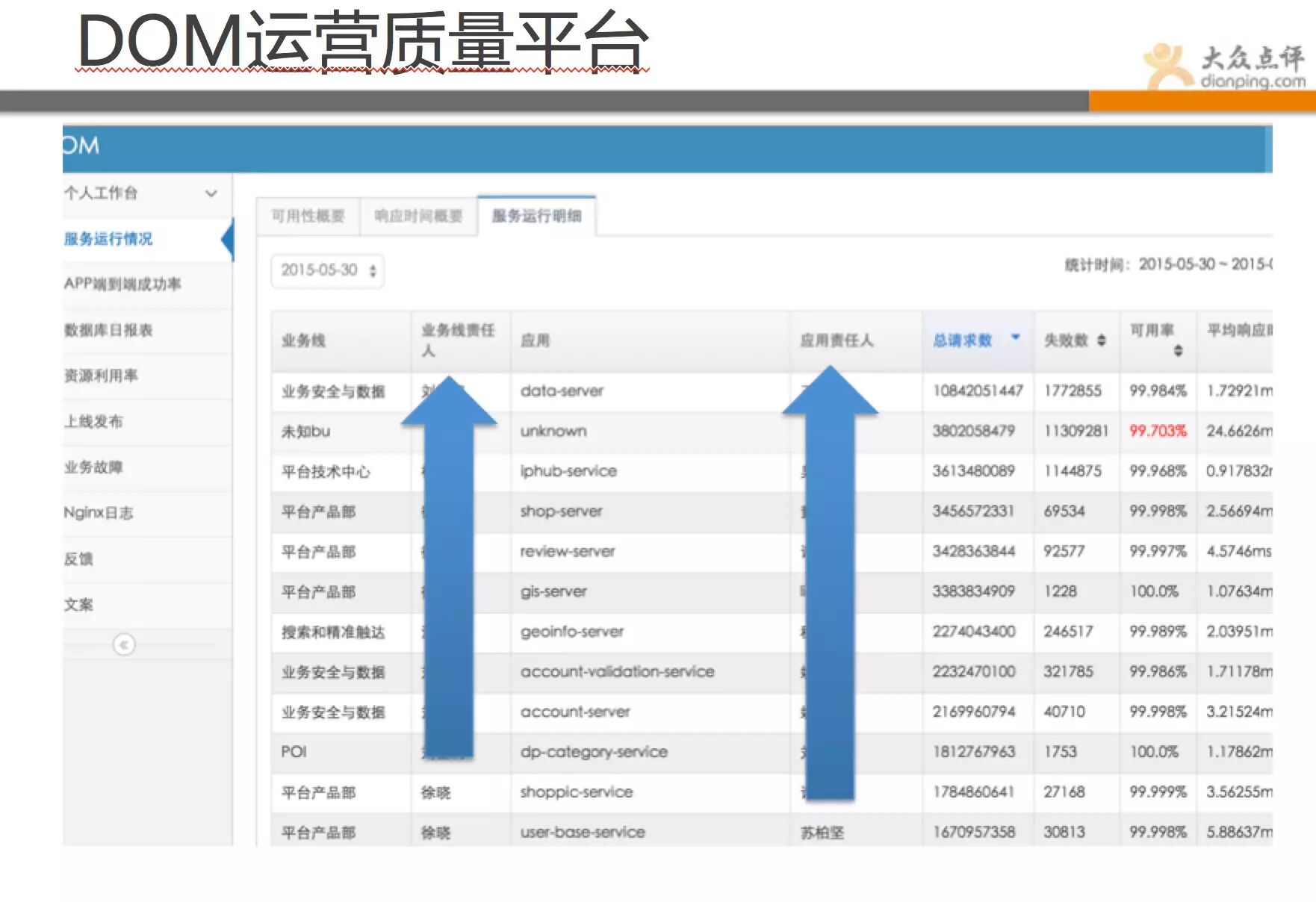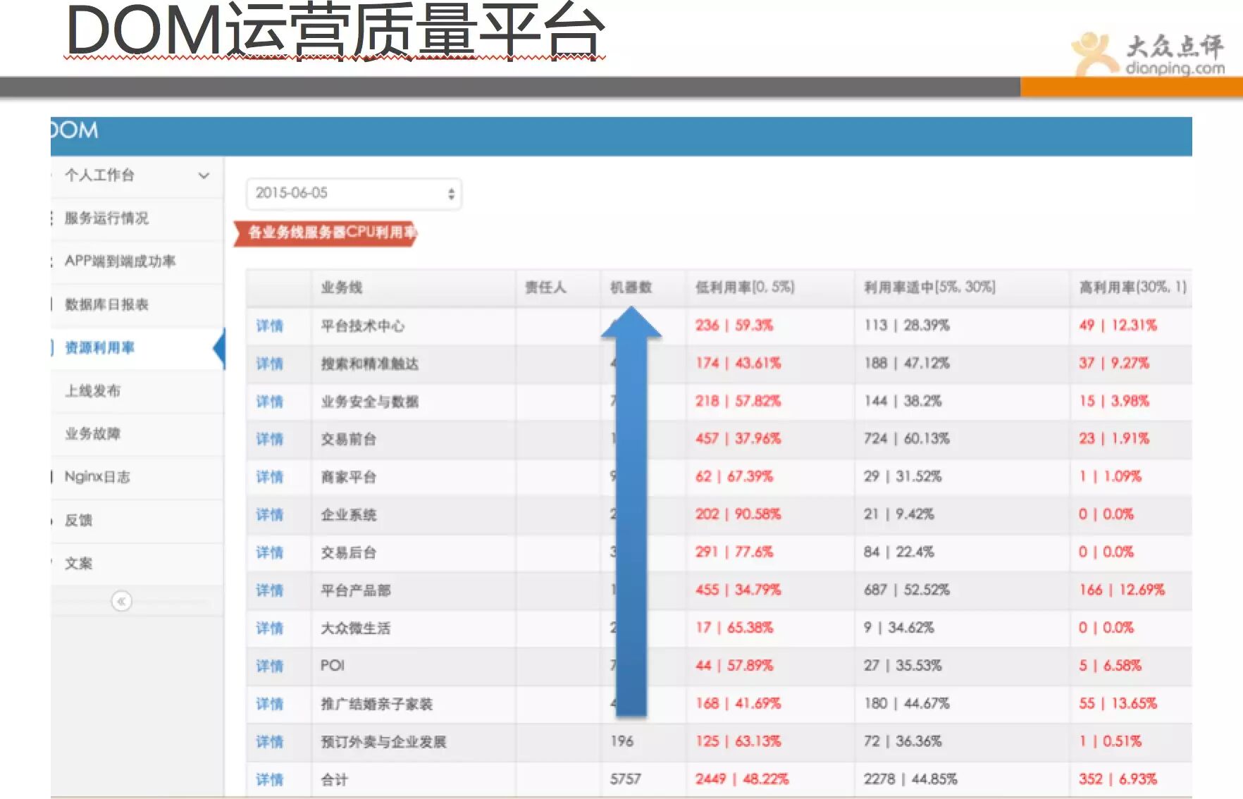 再来看下图所示是点评的DOM系统,即运营质量管理平台,该平台汇总了线上的服务器状态、应用响应质量、资源利用率、业务故障等全方位的数据汇总平台。