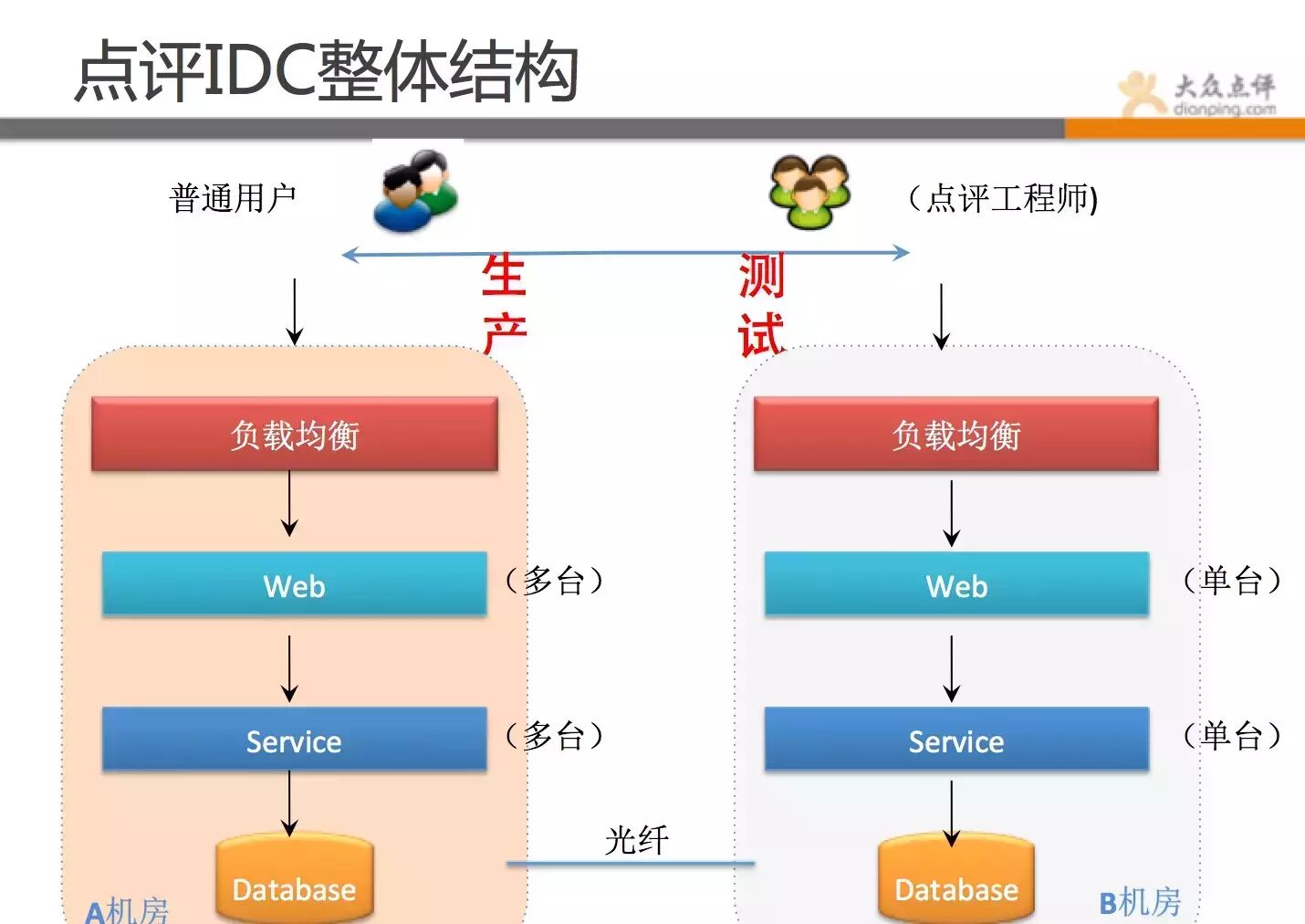 点评目前是双机房结构,A机房主跑线上业务,B机房跑测试环境和大数据处理作业,有hadoop集群、日志备份、灾备降级应用(在建)等。点评目前机房物理机+虚拟机有近万台机器。