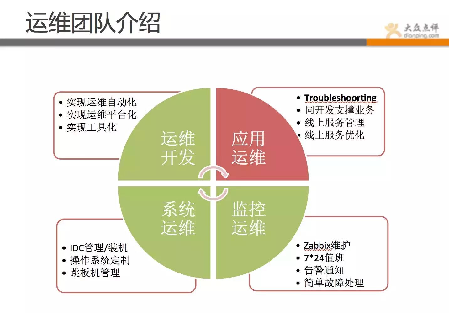 应用运维:负责支持线上业务,各自会负责对应的业务线,主要职能是保证线上业务稳定性和同开发共同支撑对应业务,以及线上服务管理和持续优化。