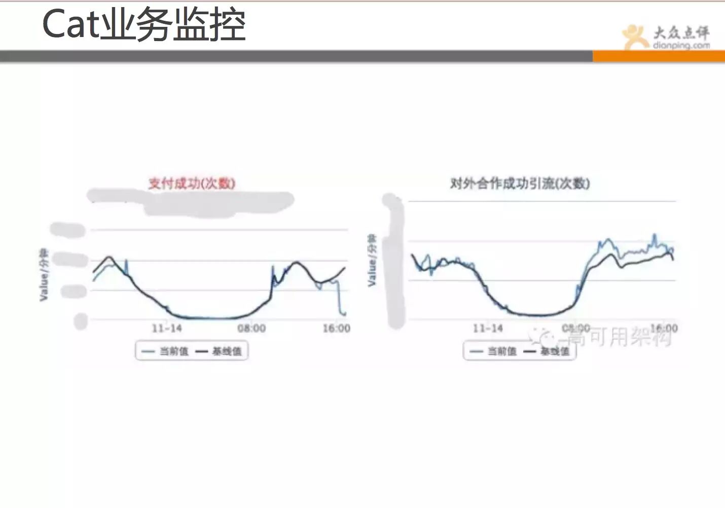 这张是cat的应用监控图表,可直观从业务角度看出问题,可跟基线的对比,发现问题所在。如图所示,此时支付远偏离基线,流量正常,可能后端出了问题。