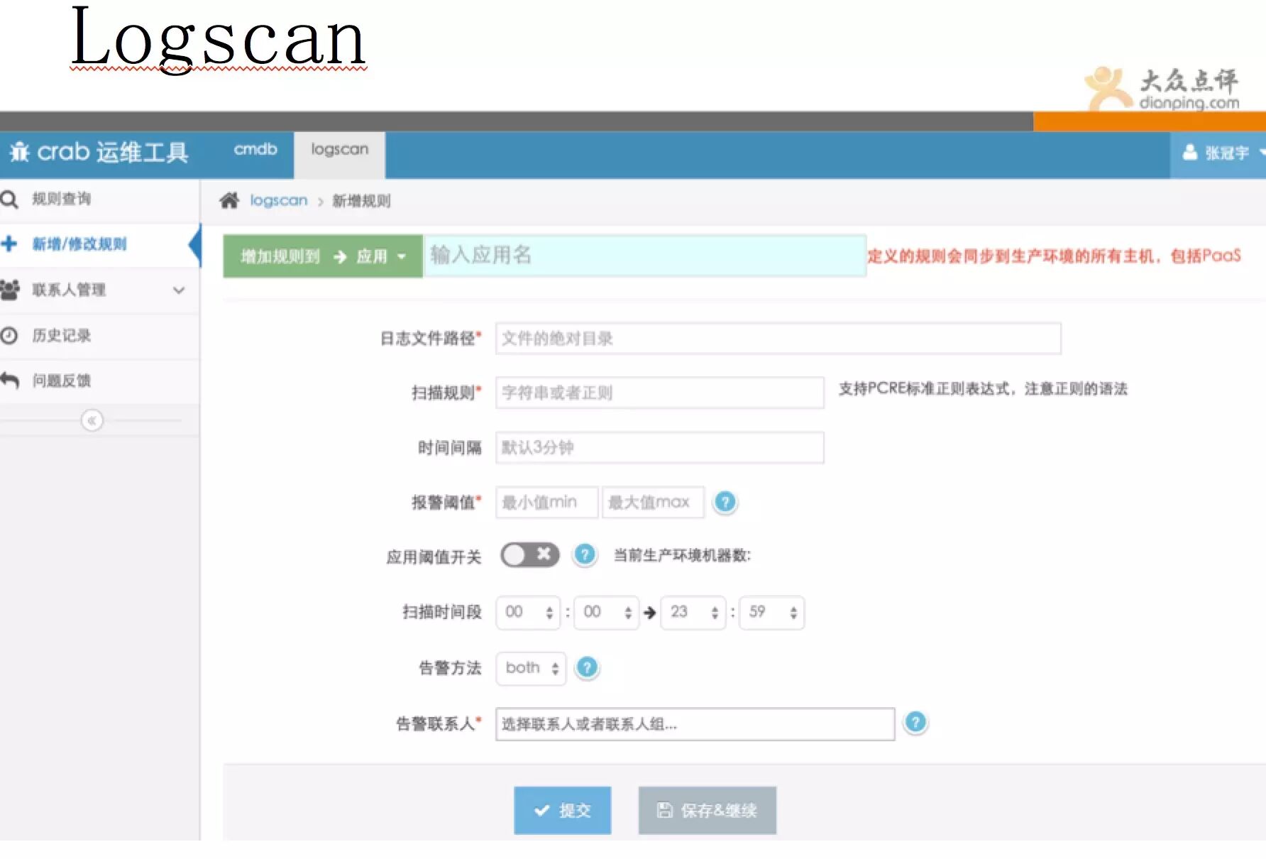 Logscan系统,是一套日志扫描工具,可根据你定义的策略,对日志内容进行定时扫描,该工具可覆盖到基于日志内容的检测,结合zabbix和cat,实现无死角覆盖。 比如有一些攻击的请求,一直遍历你的url,通过cat、zabbix等都无法灵活捕获,有了日志扫描,便可轻松发现。