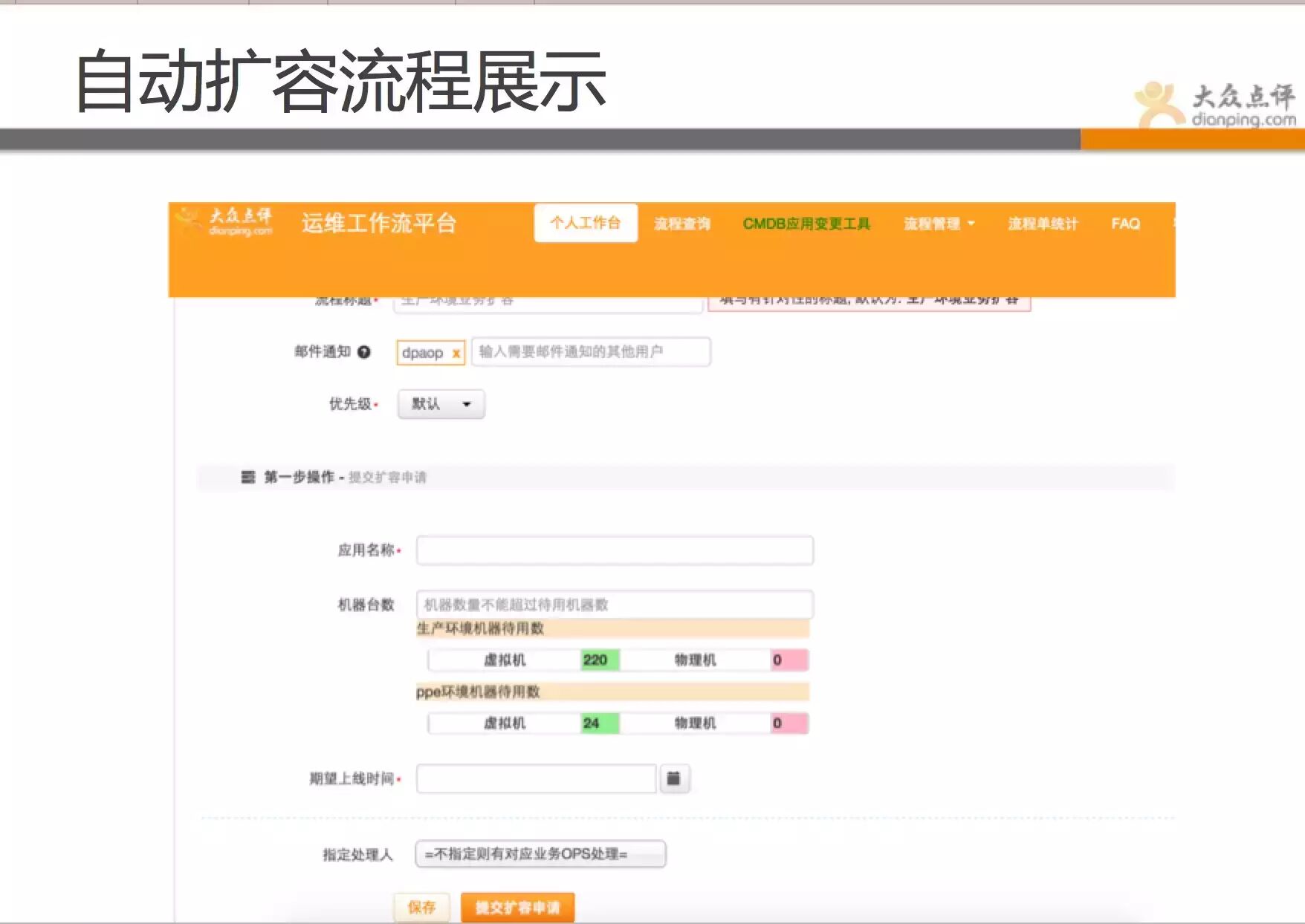 以我们线上自动化扩容流程为展示,用户使用时,需要填写对应信息,提交后,运维在后台审核过后,就完全自动化扩容,扩容完成会有邮件通知,全程运维不需要登录服务器操作。(自动化倒不是太复杂的技术难题,通过小的任务组合,设置好策略即可). 几十台机器的扩容,运维只需点个审核通过按钮,数分钟而已。
