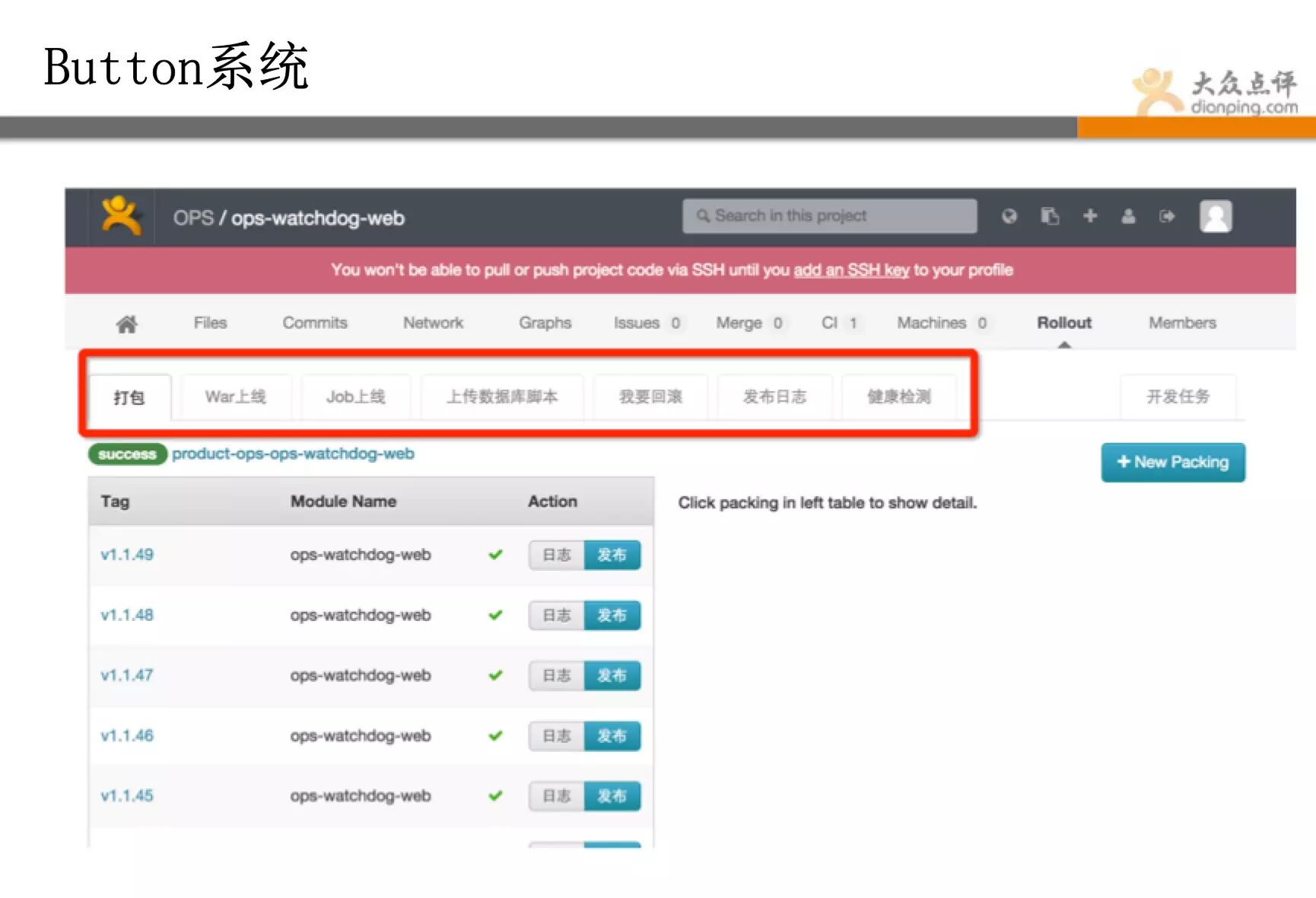 Button是一套代码管理、打包、部署上线系统,开发可完全自主化进行上传代码,自动化测试,打包,预发,灰度上线,全部上线,问题回滚等操作。 全程运维不用干预,完全平台自主化。