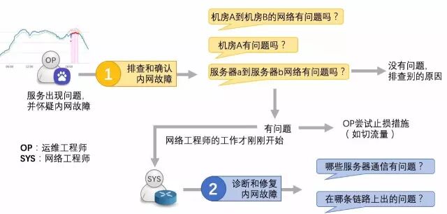 在运维实践中,工程师对内网质量监测系统都有什么样的需求呢?我们对各业务线的运维工程师,以及来自网络组的同学进行了调研。为了更好地说明用户需求,图1给出了一个典型的运维场景: