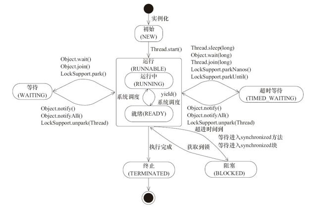 线程并不会一直处于某一种状态下,会随着程序的运行而在几种状态中来回切换。我在《Java并发编程的艺术》中找了一张图: