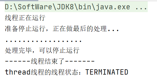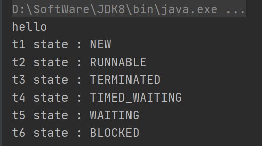 //打印完一句话后线程就运行完了,所以打印完后就进入了TERMINATED状态