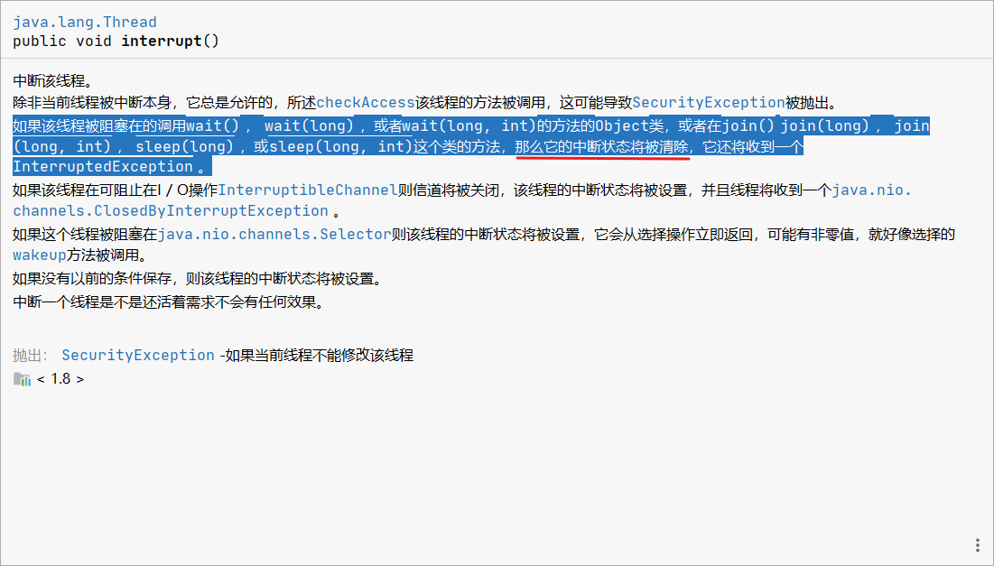 这是个静态方法,同样也是用来测试当前线程是否已经中断,和isInterrupted()方法不同的地方在于Thread.interrupted()方法会清除中断标记,也就是说连续调用两次该方法第一次的结果是true,第二次是false,而isInterrupted()不会清除中断标记。