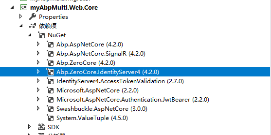 考虑到Mvc项目带有太多不相关的视图、静态资源,选择用Host项目,给Web.Core项目安装Abp.ZeroCore.IdentityServer4。因为EntityFrameworkCore项目依赖于Core项目,所以在Core项目安装Abp.ZeroCore.EntityFrameworkCore和Abp.ZeroCore.IdentityServer4.EntityFrameworkCore(仅用于演示功能实现,实际项目可能会有变化)