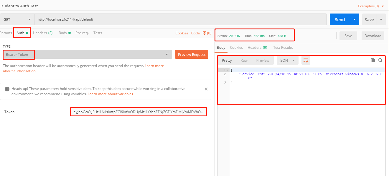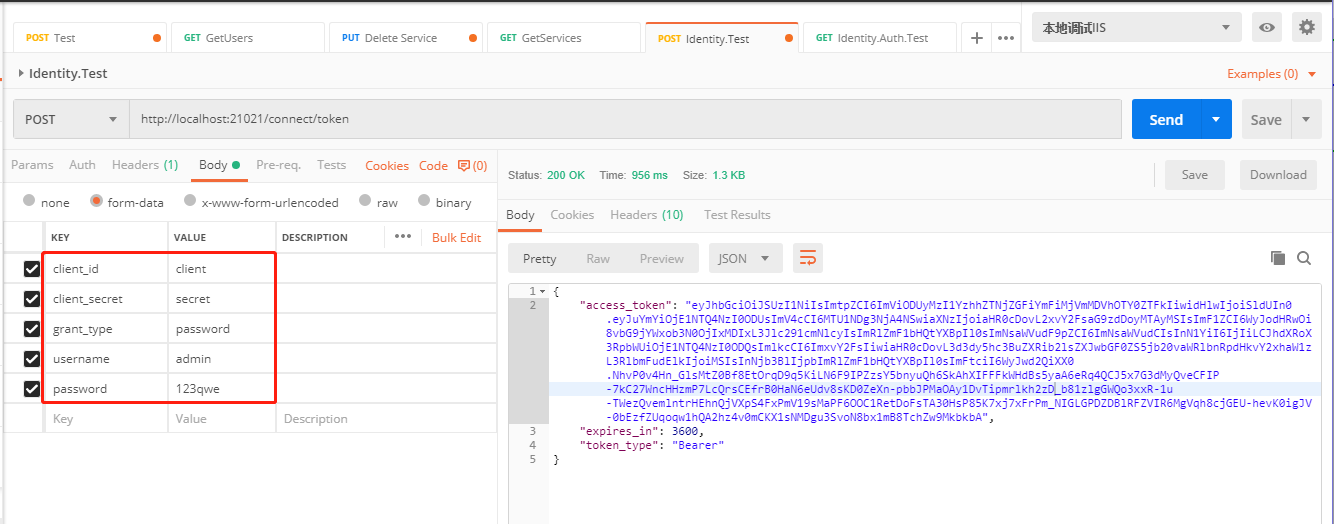 根据IdentityServerConfig中填写的client_id,client_secret,grant_type 填写postman参数,username和password为数据表abpusers中存储的user信息