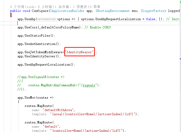 public void Configure(IApplicationBuilder app, IHostingEnvironment env) { if (env.IsDevelopment()) { app.UseDeveloperExceptionPage(); } // authentication app.UseAuthentication(); app.UseMvc(); // swagger ....... }